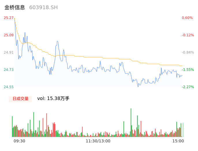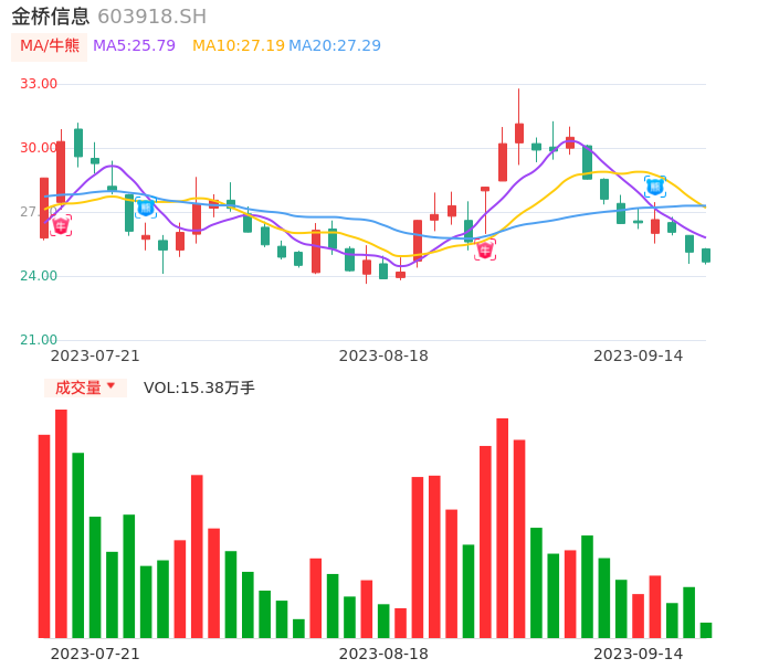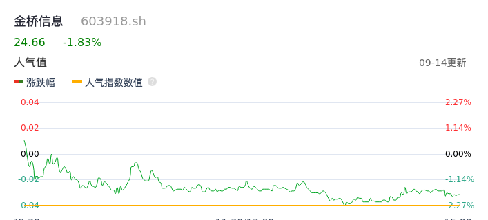 09月14日,金桥信息收报24.66,股价涨幅-1.83%,成交金额3.81亿元,换手率4.21%。
