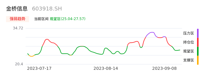 我们来看一下该股的九方特色指标强弱趋势的情况:金桥信息近日从持仓区下穿到观望区,股价出现持续调整。短期出现止跌态势,后续重点关注能否再次站上多空分界点:27.57元。如未能有效突破则可能进入新一轮空头行情。