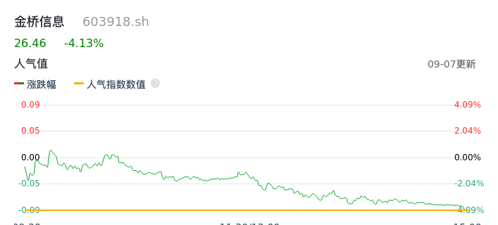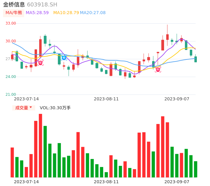 09月07日,金桥信息收报26.46,股价涨幅-4.13%,成交金额8.20亿元,换手率8.29%。