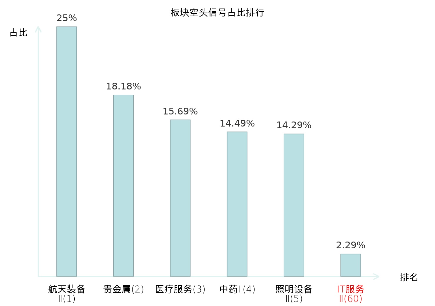 全市场所有行业板块中主力空头信号占比排名中,航天装备Ⅱ板块位居第一。物流板块名次提升最快,较昨日上升112位。