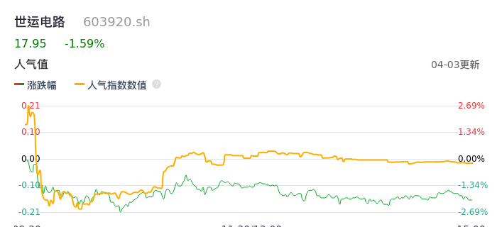 04月03日,世运电路收报17.95,股价涨幅-1.59%,成交金额1.90亿元,换手率1.96%。