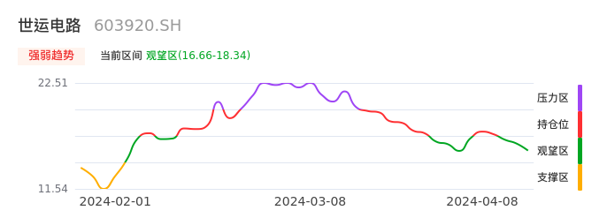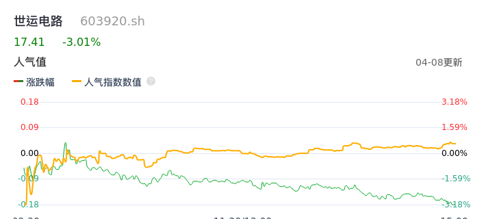 04月08日,世运电路收报17.41,股价涨幅-3.01%,成交金额2.29亿元,换手率2.41%。