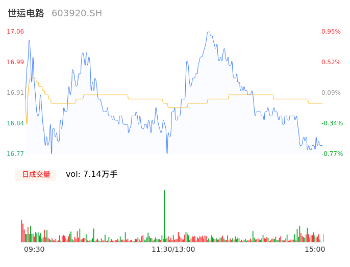 04月11日,世运电路收报16.81,股价涨幅-0.53%,成交金额1.21亿元,换手率1.32%。