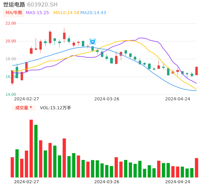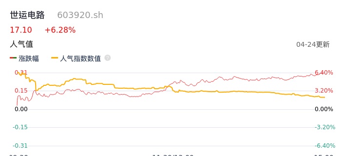 04月24日,世运电路收报17.10,股价涨幅6.28%,成交金额2.53亿元,换手率2.80%。