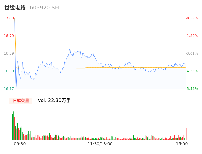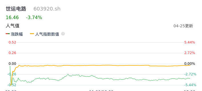 04月25日,世运电路收报16.46,股价涨幅-3.74%,成交金额3.66亿元,换手率4.13%。