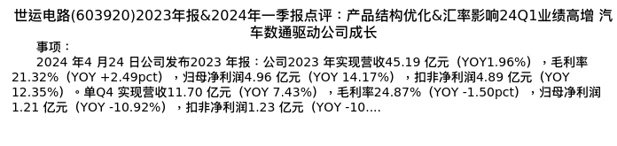 值得注意的是:2024年04月华创证券的耿琛/岳阳/姚德昌分析师,首次发布关于世运电路的研究报告,标题为:世运电路(603920)2023年报&2024年一季报点评:产品结构优化&汇率影响24Q1业绩高增 汽车数通驱动公司成长。