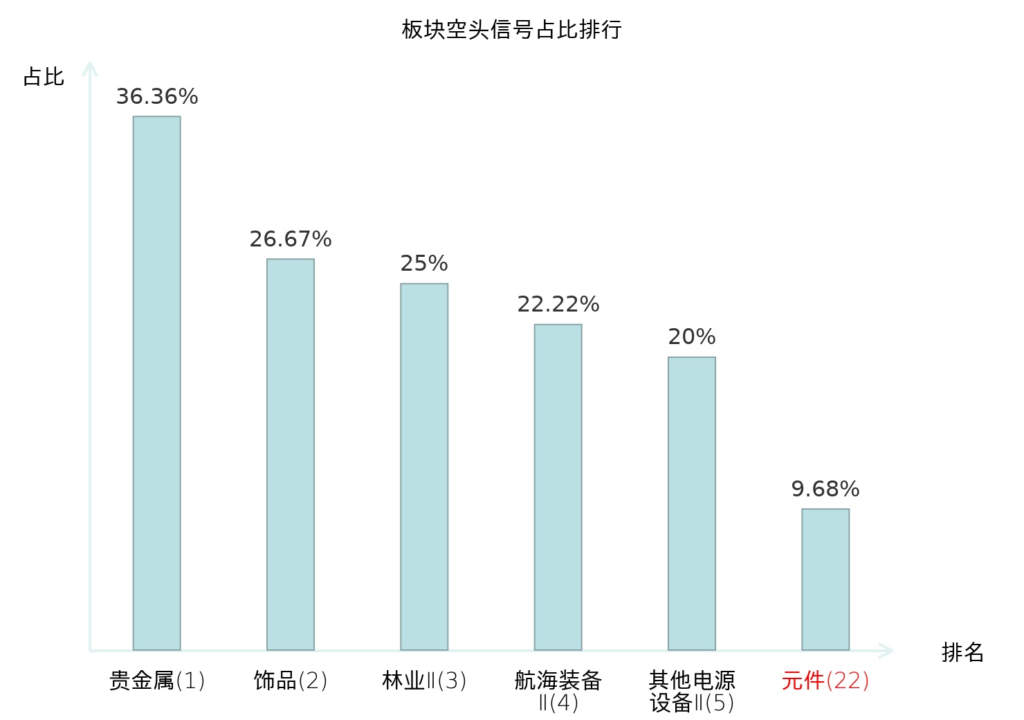 全市场所有行业板块中主力空头信号占比排名中,贵金属板块位居第一。工业金属板块名次提升最快,较昨日上升125位。