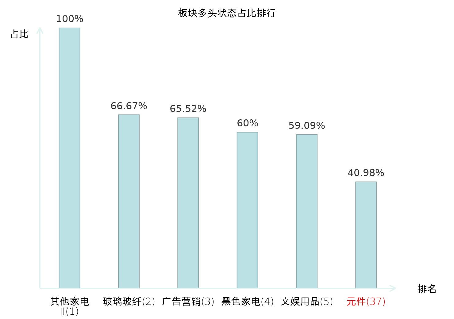 全市场所有行业板块中主力多头状态占比排名中,其他家电Ⅱ板块位居第一。体育Ⅱ板块名次提升最快,较昨日上升57位。