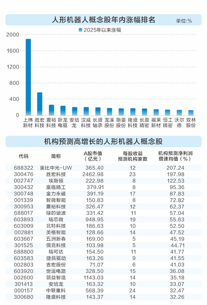 据证券时报·数据宝统计,截至9月30日,今年以来人形机器人概念股平均上涨83.6%,跑赢同期上证指数。年内涨幅翻倍的概念股多达25只。上纬新材、胜宏科技、震裕科技、卧龙电驱、安培龙等涨幅排在前5位。因智元机器人入主而备受关注的上纬新材,年内累计上涨1891.6%,成为年内A股涨幅榜冠军。