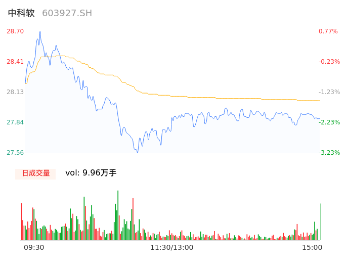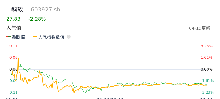 04月19日,中科软收报27.83,股价涨幅-2.28%,成交金额2.79亿元,换手率1.68%。