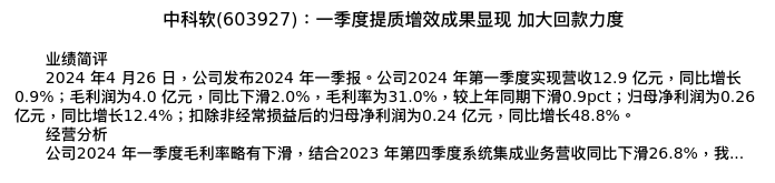 值得注意的是:2024年04月国金证券的王倩雯/孟灿分析师,首次发布关于中科软的研究报告,标题为:中科软(603927):一季度提质增效成果显现 加大回款力度。