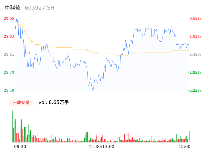 04月30日,中科软收报28.88,股价涨幅-1.20%,成交金额2.50亿元,换手率1.46%。