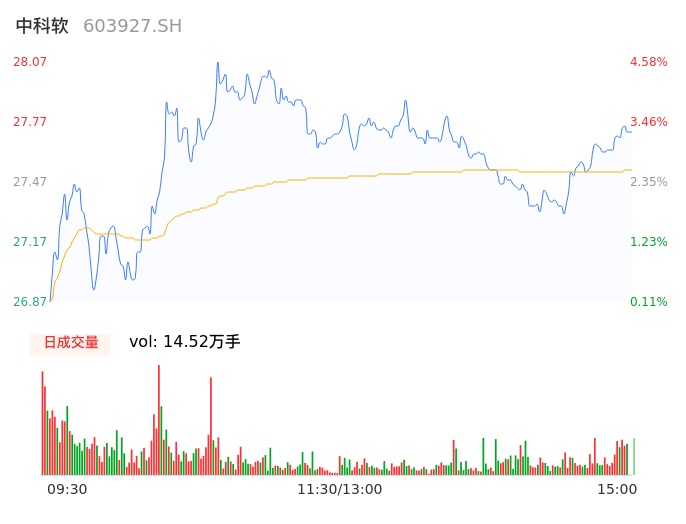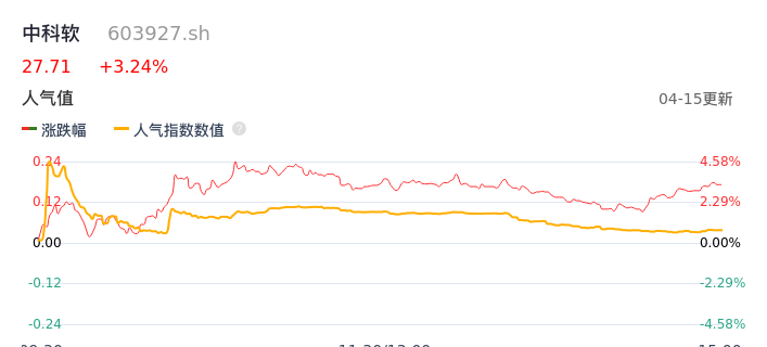 04月15日,中科软收报27.71,股价涨幅3.24%,成交金额4.00亿元,换手率2.45%。