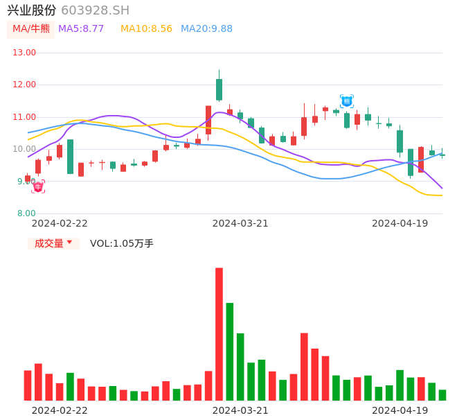 04月19日,兴业股份收报9.80,股价涨幅-0.20%,成交金额1033.59万元,换手率0.52%。