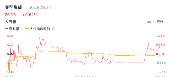 04月24日,亚翔集成收报26.15,股价涨幅0.62%,成交金额2.24亿元,换手率4.04%。