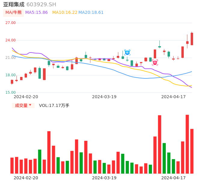 04月17日,亚翔集成收报25.26,股价涨幅6.13%,成交金额4.25亿元,换手率8.05%。