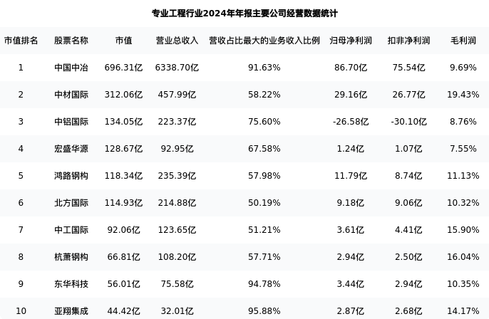 亚翔集成最新报告期数据为年报,下表汇总了专业工程行业内市值靠前的公司年报主要经营数据