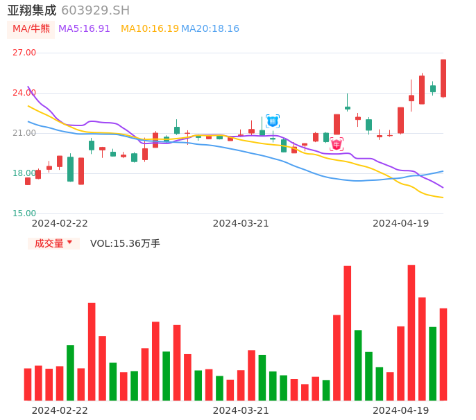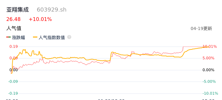 04月19日,亚翔集成收报26.48,股价涨幅10.01%,成交金额3.88亿元,换手率7.20%。
