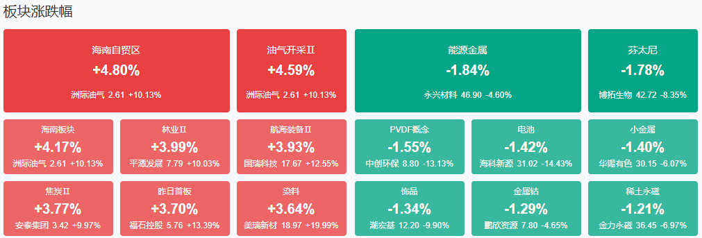 板块方面,医药、影视院线、AI应用等板块涨幅居前,保险、存储芯片、CPO等板块跌幅居前。