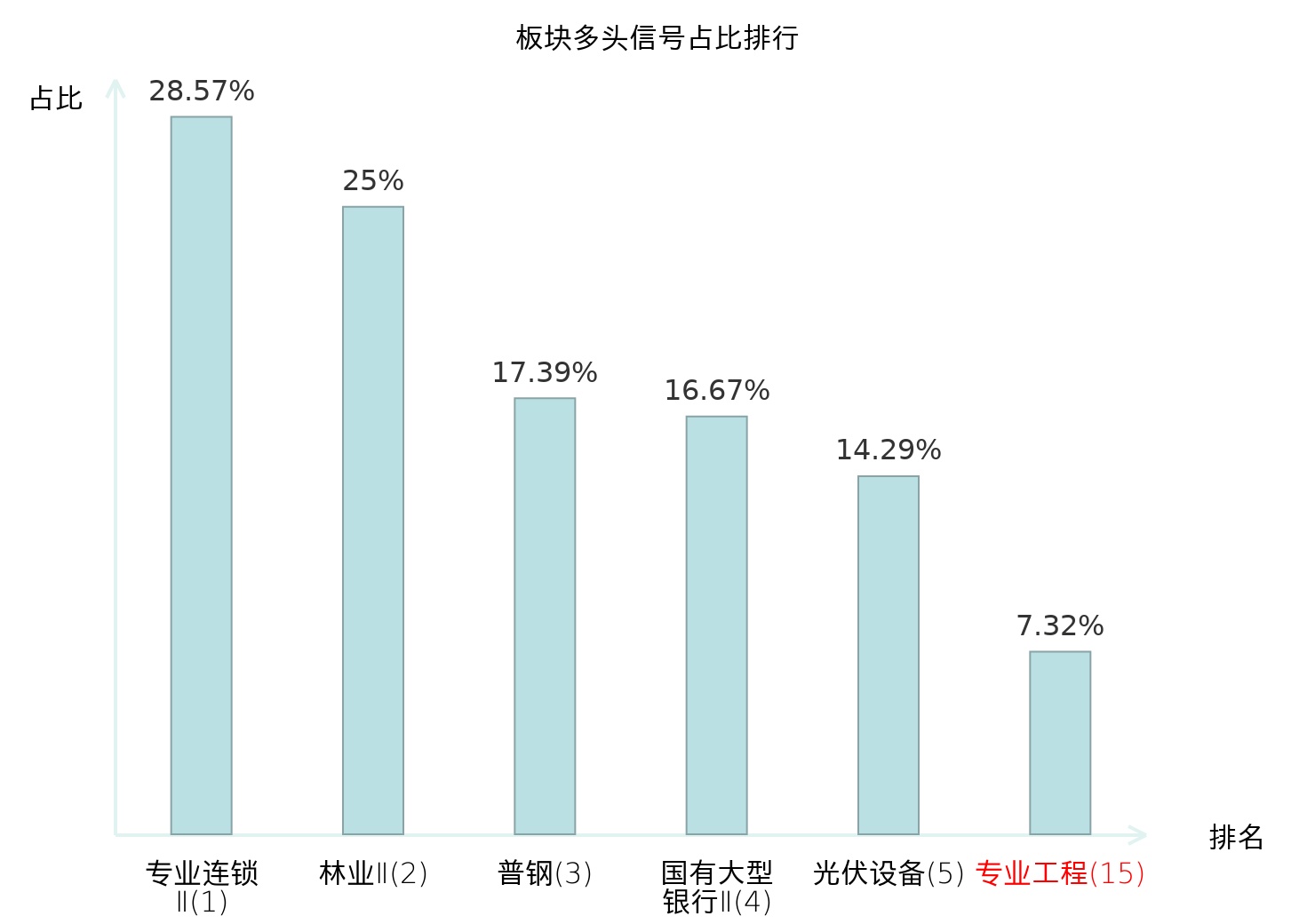 全市场所有行业板块中主力多头信号占比排名中,专业连锁Ⅱ板块位居第一。专业连锁Ⅱ板块名次提升最快,较昨日上升122位。