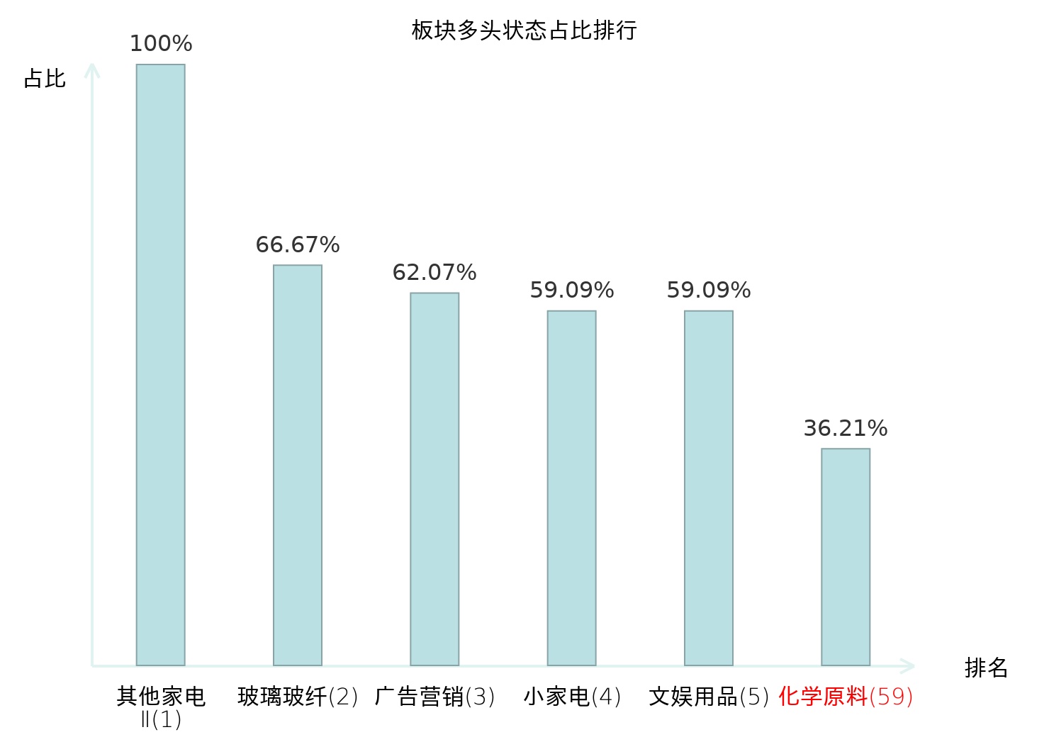 全市场所有行业板块中主力多头状态占比排名中,其他家电Ⅱ板块位居第一。消费电子板块名次提升最快,较昨日上升54位。