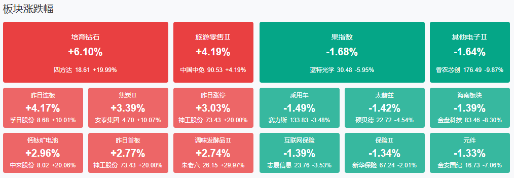 板块方面,培育钻石、乳业、光伏设备等板块涨幅居前,海南、软件开发、CPO等板块跌幅居前。截至收盘,沪指跌0.39%,深成指跌1.03%,创业板指跌1.4%。