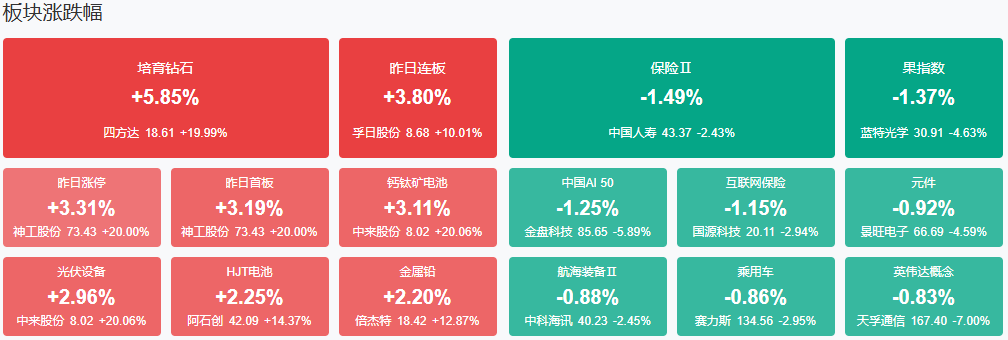 板块方面,培育钻石、光伏设备、电池等板块涨幅居前,煤炭、保险、白酒等板块跌幅居前。截至收盘,沪指跌0.38%,深成指跌0.52%,创业板指跌0.74%。