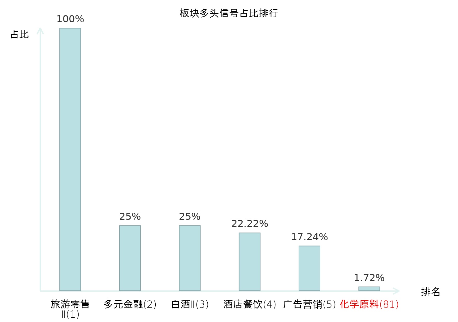 全市场所有行业板块中主力多头信号占比排名中,旅游零售Ⅱ板块位居第一。旅游零售Ⅱ板块名次提升最快,较昨日上升130位。