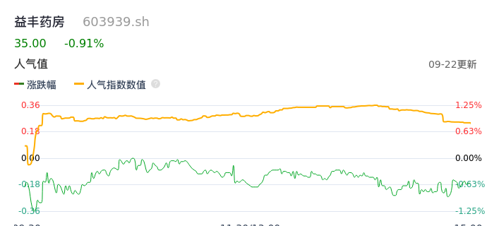09月22日,益丰药房收报35.00,股价涨幅-0.91%,成交金额1.50亿元,换手率0.42%。