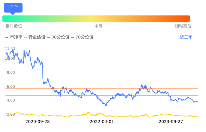 益丰药房当前市净率PB为3.89,在所属的医药商业中,市净率PB排28,前五名分别为重药控股市净率0.89、瑞康医药市净率0.98、嘉事堂市净率1.00、上海医药市净率1.03、国药一致市净率1.06。益丰药房当前市净率PB为3.89,超过近3年5.91%的历史数据。