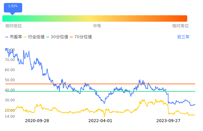 2023年09月27日,益丰药房下跌0.98%收于35.27,今日成交金额1.52亿元。下文将从市盈率PETTM、市净率PB、市现率3个角度去分析公司估值情况。