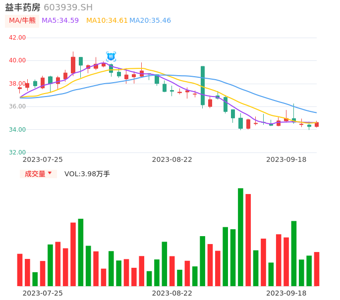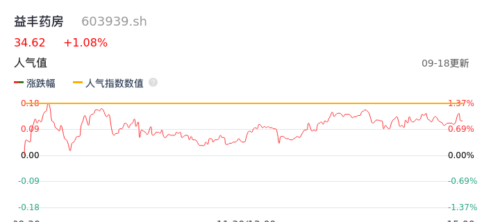 09月18日,益丰药房收报34.62,股价涨幅1.08%,成交金额1.37亿元,换手率0.40%。