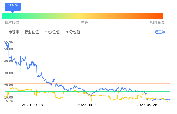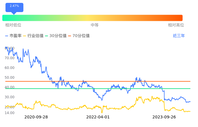 2023年09月26日,益丰药房上涨1.51%收于35.62,今日成交金额1.71亿元。下文将从市盈率PETTM、市净率PB、市现率3个角度去分析公司估值情况。