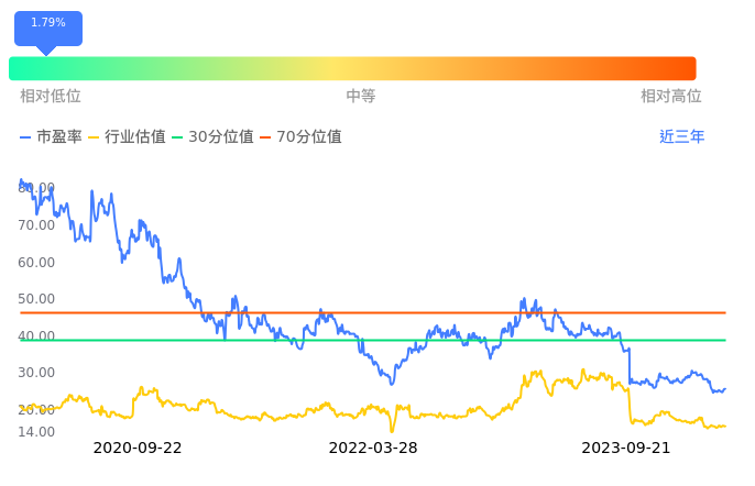 2023年09月21日,益丰药房下跌0.37%收于35.32,今日成交金额1.71亿元。下文将从市盈率PETTM、市净率PB、市现率3个角度去分析公司估值情况。