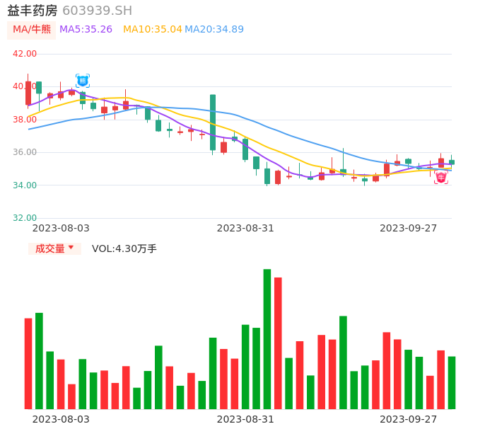 09月27日,益丰药房收报35.27,股价涨幅-0.98%,成交金额1.52亿元,换手率0.43%。