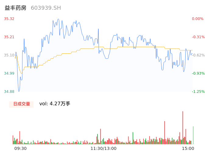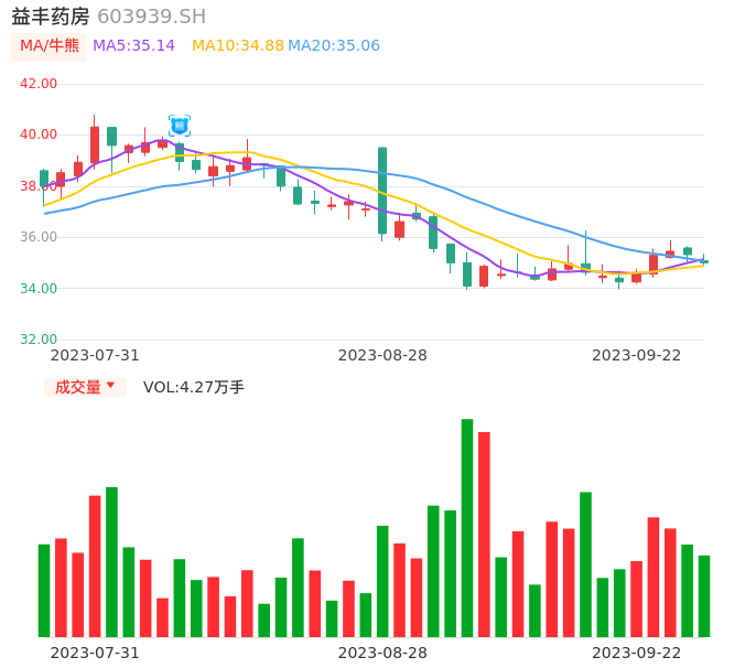 09月22日,益丰药房收报35.00,股价涨幅-0.91%,成交金额1.50亿元,换手率0.42%。