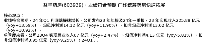 值得注意的是:2024年04月广发证券的罗佳荣/李桠桐分析师,首次发布关于益丰药房的研究报告,标题为:益丰药房(603939):业绩符合预期 门诊统筹药房快速拓展。