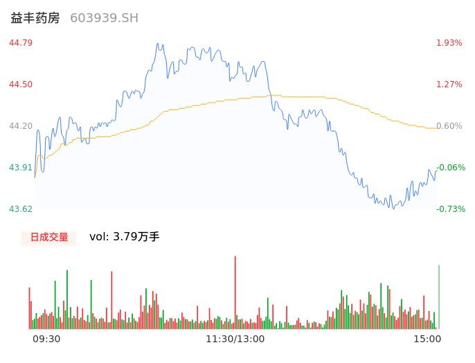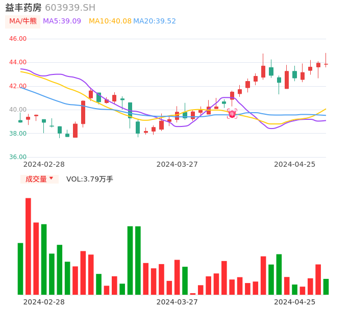 04月25日,益丰药房收报43.86,股价涨幅-0.18%,成交金额1.68亿元,换手率0.38%。