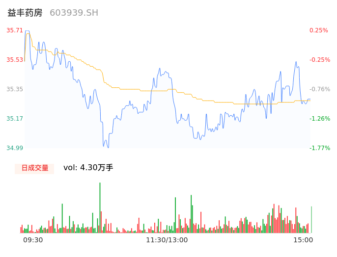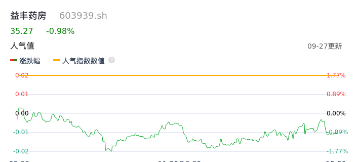 09月27日,益丰药房收报35.27,股价涨幅-0.98%,成交金额1.52亿元,换手率0.43%。
