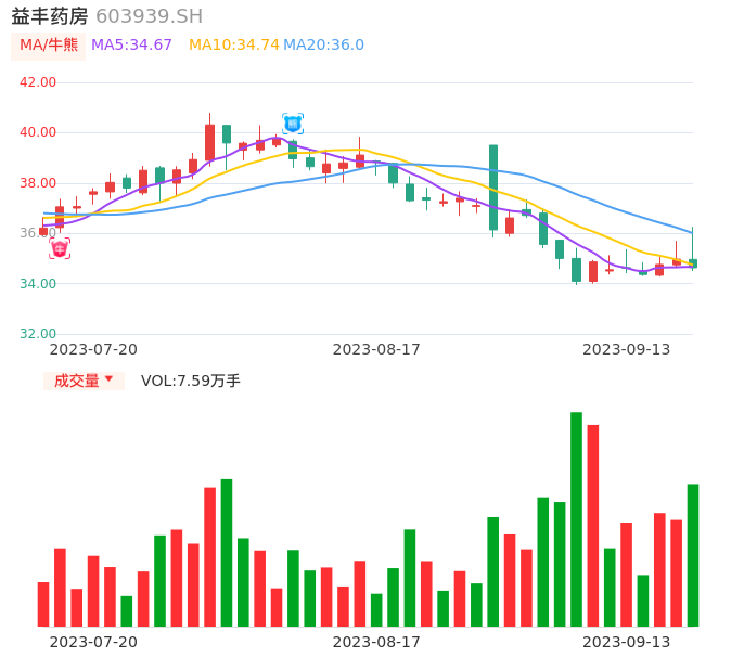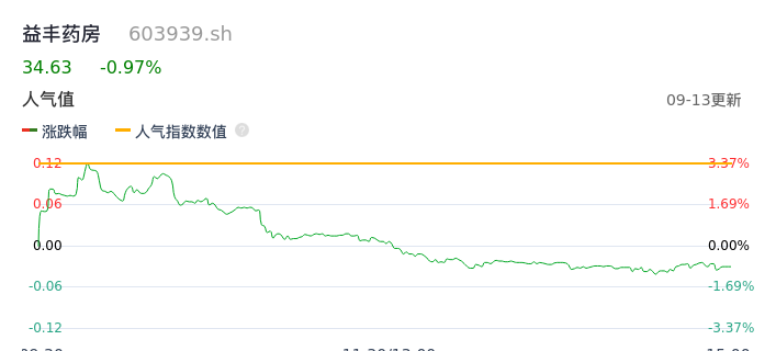 09月13日,益丰药房收报34.63,股价涨幅-0.97%,成交金额2.68亿元,换手率0.75%。