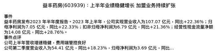 值得注意的是:2023年09月华安证券的谭国超/李昌幸分析师,首次发布关于益丰药房的研究报告,标题为:益丰药房(603939):上半年业绩稳健增长 加盟业务持续扩张。