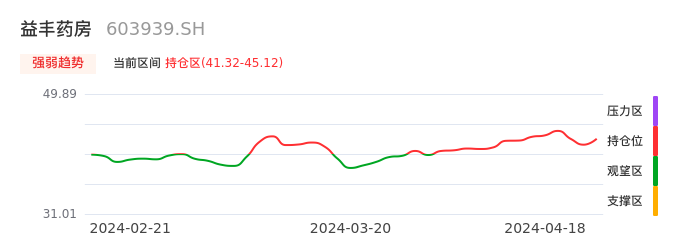 我们来看一下该股的九方特色指标强弱趋势的情况:益丰药房自03月29日从观望区上穿到持仓区。股价近期在多头区域持续强势上扬,上升动能仍较为充足,可积极关注。后续重点关注上方压力位:45.12元是否能突破上攻。