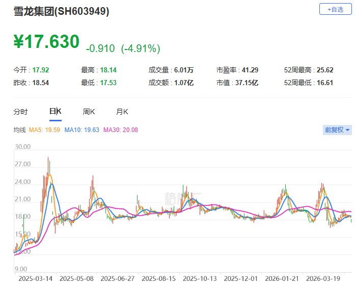 A股异动丨雪龙集团跌近5% 股东贺频艳、贺群艳及宁波联展拟合计减持不超4%股份