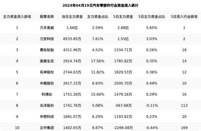 从主力资金流向来看,汽车零部件行业今日主力资金流入91.67亿元,在所有申万二级行业中排名:30/131。
