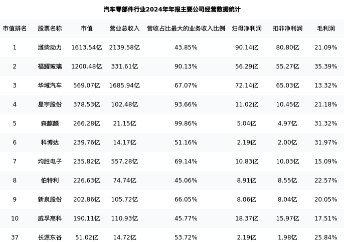 长源东谷最新报告期数据为年报,下表汇总了汽车零部件行业内市值靠前的公司年报主要经营数据