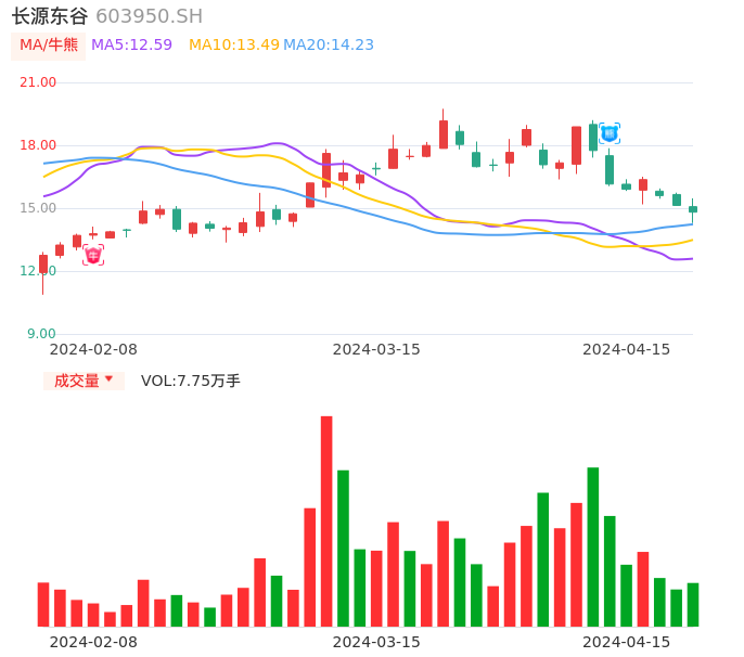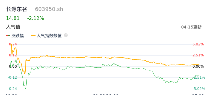04月15日,长源东谷收报14.81,股价涨幅-2.12%,成交金额1.15亿元,换手率2.39%。