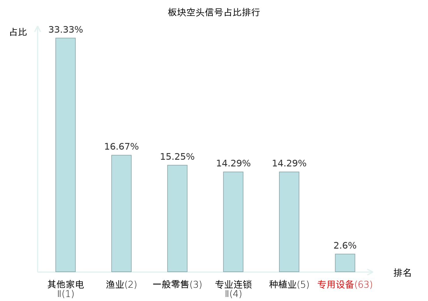 全市场所有行业板块中主力空头信号占比排名中,其他家电Ⅱ板块位居第一。造纸板块名次提升最快,较昨日上升115位。