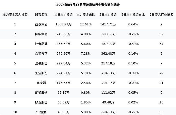 从主力资金流向来看,服装家纺行业今日主力资金流入9.10亿元,在所有申万二级行业中排名:98/131。