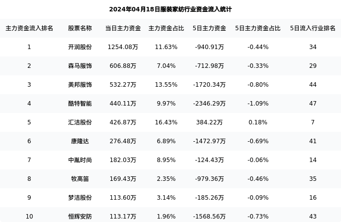 从主力资金流向来看,服装家纺行业今日主力资金流入6.09亿元,在所有申万二级行业中排名:38/131。