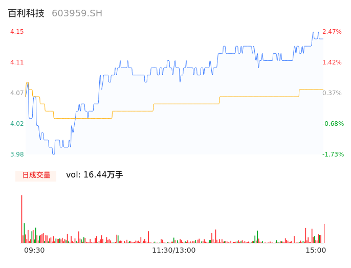 04月24日,百利科技收报4.15,股价涨幅2.47%,成交金额6697.96万元,换手率3.35%。